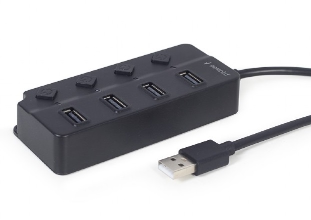 USB 2.0 Hub 4-port with switches, cable 80 cm, Gembird UHB-U2P4P-01, Black 4-портовый USB-концентратор со встроенным кабелем Практичные кнопки включения/выключения и светодиодные индикаторы состояния 4 порта USB 2.0 Может питаться от розетки постоянного тока (адаптер питания не входит в комплект)