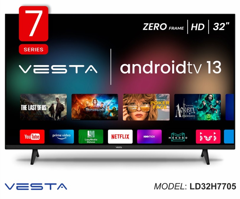 Vesta LD32H7705 Bluetooth Модель 2023 года Zero Frame Диагональ 32" (82 см) AndroidTV 13 Google Play Market WiFi 2,4/5 GHz Bluetooth Разрешение HD 1366x768 Цифровой тюнер DVB-T/T2/C/Ci+