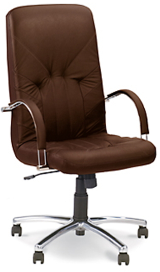 Кресло руководителя на хромированной базе и подлокотниками, обитыми кожей. Оснащено механизмом качания, регулируется по высоте.