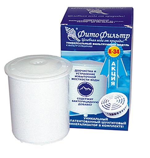 К–34 Картридж (модуль) Подходит к фильтр-кувшинам АКВАФОР старых моделей. Комплектуется отдельным шунгитовым минерализатором. Ресурс модуля и минерализатора – 400 л. Состав и принцип действия фильтрующего модуля: - Высококачественный кокосовый активированный уголь, содержащий серебро, очищает воду от активного хлора, органических и хлорорганических загрязнений, других вредных веществ. Устраняет неприятные запахи и привкусы. Обработка угля серебром предотвращает возможность размножения бактерий внутри модуля. -Высокоэффективная ионообменная смола очищает от ионов токсичных металлов и снижает жесткость воды. -Обработанный специальным образом природный минерал шунгит очищает воду от фенолов, нефтепродуктов, торфяных гидролизатов, гуминовых и других вредных веществ. Обладает мощным бактерицидным эффектом. Насыщает воду полезными для здоровья фуллеренами.