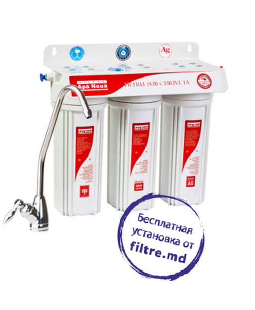 Фильтр под мойку 3 – ступенчатая очистка. Непрозрачные колбы. Отдельный керамический кран для чистой воды. Общий ресурс фильтрующих картриджей - до 30000л. Рекомендуемая скорость фильтрации - от 2.0 до 3.0 л/мин. FF – 4 AN 3 эффективно очищает водопроводную воду от вредных примесей (хлора, тяжёлых металлов, нитратов, пестицидов, взвешенных частиц и др.) Фильтрующие картриджи фильтра изготовлены с учётом свойств и состава Молдавской воды. Устанавливается стационарно, под мойкой. Температура очищаемой воды: до +40 С° Максимальное рабочее давление воды – до 8 атм. Используемые картриджи: K–1AN, К–3 AN и К-5 AN Ресурс картриджа К-1 AN – 20 000 л. или от 3 до 6 месяцев Ресурс картриджа К-3 AN – 30 000 л. с учетом многократных регенераций. Периодичность регенераций составляет от 150 до 300 литров и зависит от качества исходной жесткости воды. Ресурс картриджа К-5 AN - 6 000 л. или от 3 до 6 месяцев
