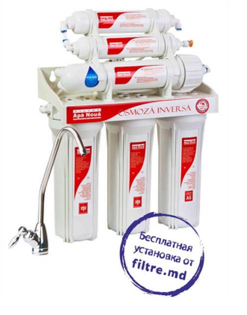 Фильтр под мойку Фильтр обратноосмотический 6-ти ступенчатый. Очищает воду на молекулярном уровне. Отдельный керамический кран для чистой воды. FF – OSMOS AN 6 практически полностью удаляет из воды не только вредные примеси, но и соли жёсткости. При использовании фильтра этой модели не будет никакой накипи на стенках нагревательных элементов электрочайников, утюгов, кофеварок и т. д. Фильтрующие картриджи фильтра изготовлены с учётом свойств и состава Молдавской воды. Устанавливается стационарно, под мойкой. Производительность: 190 – 250 литров в сутки. Степень очистки: 96% - 99,9% Снижение солесодержания воды: 99,9% Температура очищаемой воды: 4°С + 40°С Давление воды на входе: от 2,8 до 8 атм. Резервуар для чистой воды: 15 литров (рабочий объем – 10 литров) Используемые картриджи: K – 1 AN (5мкр), К – 1 AN (1мкр), К-5 AN, К-8 AN, К-9 AN , M-2 AN Ресурс картриджа К-1 AN (5мкр), – 20 000 л. или от 3 до 6 месяцев Ресурс картриджа К- 1 AN (1мкр), – 20000 л. или от 3 до 6 месяцев. Ресурс картриджа К- 5 AN – 6 000 л. или от 3 до 6 месяцев. Ресурс картриджа К- 8 AN – 12 месяцев. Ресурс картриджа К- 9 AN – не менее 24 месяцев при условии своевременной замены картриджей К-1 AN, К-1 AN, К-5 AN. Ресурс картриджа M-2 AN - 12 месяцев.