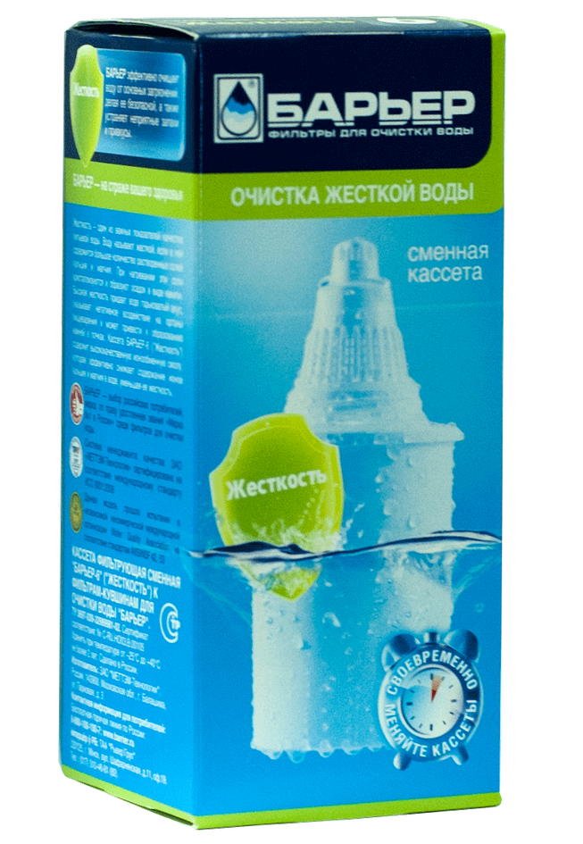 Сменная кассета Барьер-6 снимает избыточную жесткость воды. Вдобавок очищает воду от основных загрязнителей: хлора и хлорорганических соединений, пестицидов и нефтепродуктов. Кассета Барьер Жесткость содержит высококачественную ионообменную смолу. Она эффективно снижает содержание ионов магния и кальция в воде, что уменьшает ее жесткость. Жесткость - важнейший показатель питьевой воды. Вода будет считаться жесткой, если она содержит большое количество растворенных солей магния и кальция. При нагревании эти соли образуют осадок в виде накипи (кристаллизируются). Высокая жесткость питьевой воды нарушает баланс минеральных веществ, оказывает негативное воздействие на ораны пищеварения, придает воде горьковатый вкус.