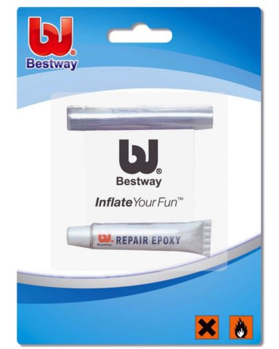 Ремкомплект Bestway надувные изделия. В комплект входят две полоски 3-винил долговечны слоя и клея герметично закрытой пробирке - 20 г. И полезно в путешествиях и в домашних условиях. После связывания продукт можно использовать не ранее чем через 12 часов. Подходит для ремонта: бассейны, лодки, надувные матрасы и т.д. Включает в себя: Труба Клей (эпоксидная-Цемент-винил): 5 гр. Патч ~ 15х15 см