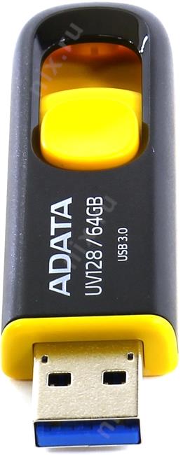 Флешка ADATA, DashDrive UV128, 64Gb, USB3.0, black-yellow (Read-90MB/s, Write-40MB/s), Retractable флэш-накопитель 64 ГБ интерфейс USB 3.0 выдвижной разъем скорость чтения/записи: 90/40 МБ/с
