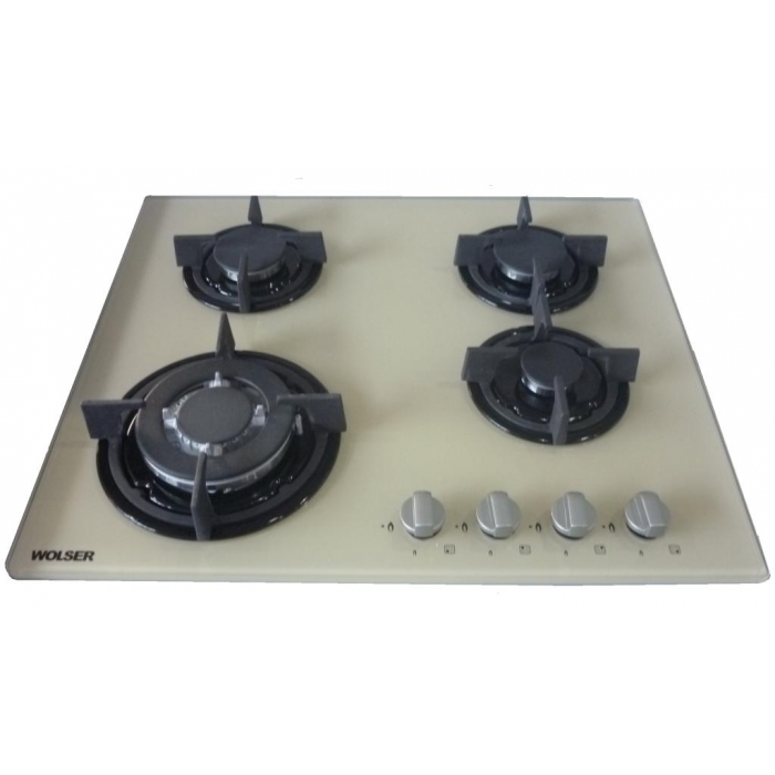 Варочная панель Wolser WL- 6400 GT IC Ivory Стеклянная поверхность 4 газовые горелки Независимые чугунные решетки конфорок Защита от утечки газа Электроподжиг Турбогорелка Размеры: 580x500x80мм.
