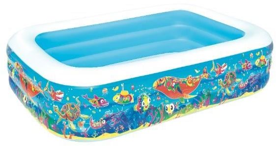 Бассейн 229x152x56 см BestWay Бассейн надувной "Подводный мир" (54120) 229х152х56 см. - удобный и практичный бассейн позволит вашей семье в жаркую летнюю погоду получить максимум удовольствия от отдыха на свежем воздухе. Небольшая глубина надувного бассейна позволяет детям уверенно чувствовать себя в воде. Бассейн сделан из прочного материала, что является залогом надежности и безопасности. Стенки бассейна состоят из двух надувных колец. Установка бассейна Bestway является простым делом, не требующим каких либо специальных знаний или усилий, а так же не занимает много времени. - Вид бассейна - прямоугольные. - Глубина - 56 см. - Объём - 702 л. В комплект входят: - Ремкомплект;