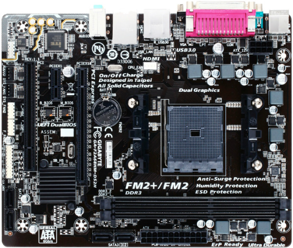 "MB SFM2+ Gigabyte GA-F2A68HM-DS2H 1.1 (AMD A68,mATX) AMD A series & Athlon series processors 2xDDR3 (2400 OC/1866/1600/1333/1066) ,VGA,HDMI,1xPCI-Ex16, 1xPCI+2xPCI-Ex1,4xSATA 6Gb/s,RAID 0/1/10, 2xUSB 3.0,8xUSB 2.0,Gbit LAN,HD Audio 8ch."