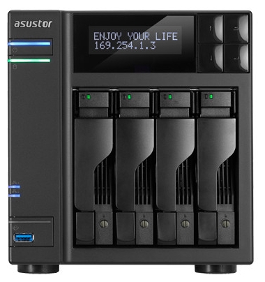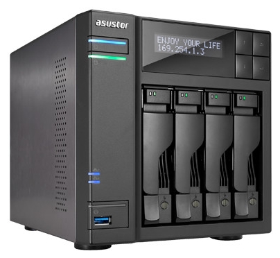 4-bay NAS Server ASUSTOR "AS7004T", Intel Core i3-4330 (Dual-Core) 3.5GHz, 2GB DDR3L(Max.16GB), 2.5"/3.5"SATA x4 (Hot Swap), LCD Panel, USB3.0 x3, USB2.0 x2, eSATA x2, GigaLAN x2, HDMI, S/PDIF, AES-NI, HT, IR, Surveillance: <49 (4 Free)