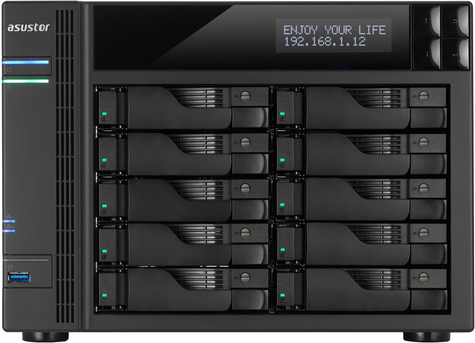 10-bay NAS Server ASUSTOR "AS6210T", Intel Celeron N3150 (Quad-Core) 1.6-2.24GHz, 4GB DDR3L(Max.8GB), 2.5"/3.5"SATA x10 (Hot Swap), LCD Panel, USB3.0 x3, USB2.0 x2, eSATA x2, Gigabit LAN x4, HDMI, S/PDIF, AES-NI, HT, IR, Surveillance: <25 (4 Free)