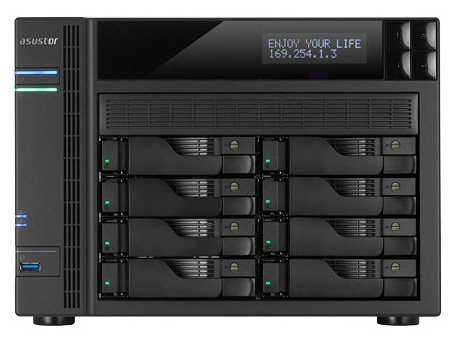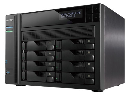8-bay NAS Server ASUSTOR "AS7008T", Intel Core i3-4330 (Dual-Core) 3.5GHz, 2GB DDR3L(Max.16GB), 2.5"/3.5"SATA x8 (Hot Swap), LCD Panel, USB3.0 x3, USB2.0 x2, eSATA x2, GigaLAN x2, PCIe x1, HDMI, S/PDIF, AES-NI, HT, IR, Surveillance: <49 (4 Free)