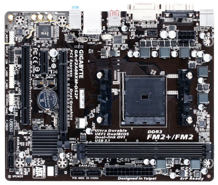 GIGABYTE GA-F2A88XM-DS2P, Socket FM2/FM2+, AMD A88x, Dual 2xDDR3-2400, APU AMD graphics, DVI, 1xPCIe X16, 4xSATA3(6Gb/s), RAID, 1xPCIe X1, 1xPCI, ALC887 7.1ch HDA, GigaBit LAN, 4xUSB3.0(5Gb/s), 2xUSB3.1, UD4, mATX