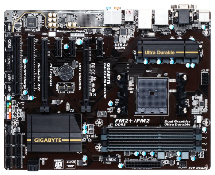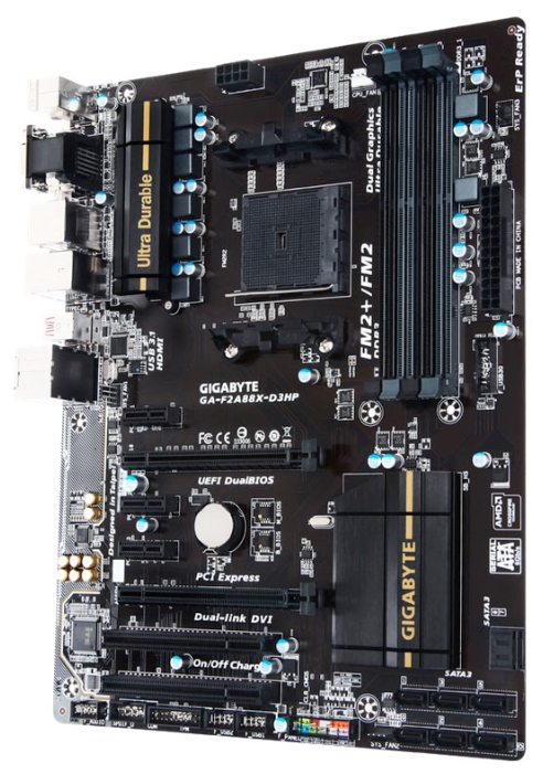 GIGABYTE GA-F2A88X-D3HP, Socket FM2/FM2+, AMD A88x, Dual 4xDDR3-2400, APU AMD graphics, DVI, HDMI, 2xPCIe X16, 8xSATA3(6Gb/s), RAID, ALC892 7.1ch HDA, GigaBit LAN, 1xUSB3.1, 1xUSB3.1/Type-C, 4xUSB3.0, UD4, ATX