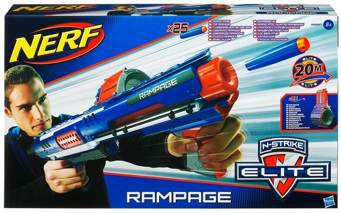 Нерф Рэмпейдж Бластер Нерф Элит Рэмпейдж оснащен специальной съемной обоймой барабанного типа, вмещающей 25 патронов, может стрелять как одиночными патронами, так и очередями. Для стрельбы очередью надо держать спусковой курок нажатым и постоянно помпой (второй рукояткой) подкачивать воздух. Барабан со стрелами под прозрачной крышкой, так что стрелок всегда может контролировать остаток боезапаса. Магазин автомата вмещает 25 зарядов — безопасных стрел, выполненных из мягкого пластика. Дальность стрельбы: до 22 м. Детям от: 7 лет В комплекте: Бластер, крепеж барабана, барабан на 25 патронов, 25 патронов, инструкция