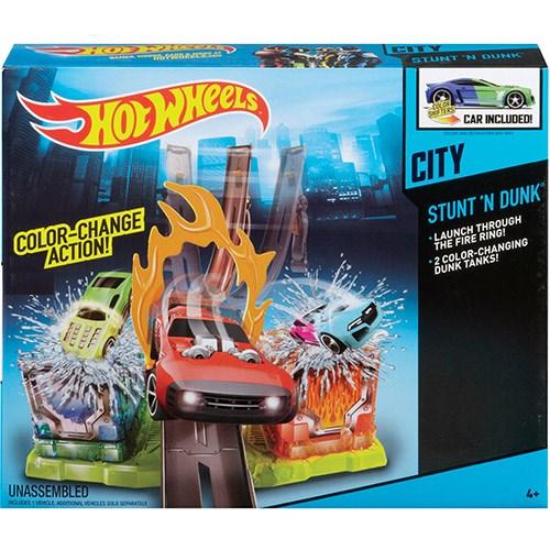 RO: Acest set de acrobatii Hot Wheels - culori schimbatoare include un interesant joc cu apa si culori schimbatoare! Setul lanseaza masina pe rampa si printr-un cerc de foc dar fiti atenti la rezervoarele de apa de pe celalalta parte. Daca masina se strop