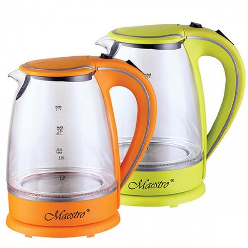 Электрочайник Maestro MR - 064 Цвет Оранжевый / Зеленый Объем 1,7 л Тип нагревательного элемента Скрытый Мощность 2000 Вт Материал корпуса Стекло/пластик Вращение на 360° Да Индикация включения Да Индикатор уровня воды Да Фильтр от накипи Да Автоматическое отключение при отсутствии воды Да Отключение при закипании Да