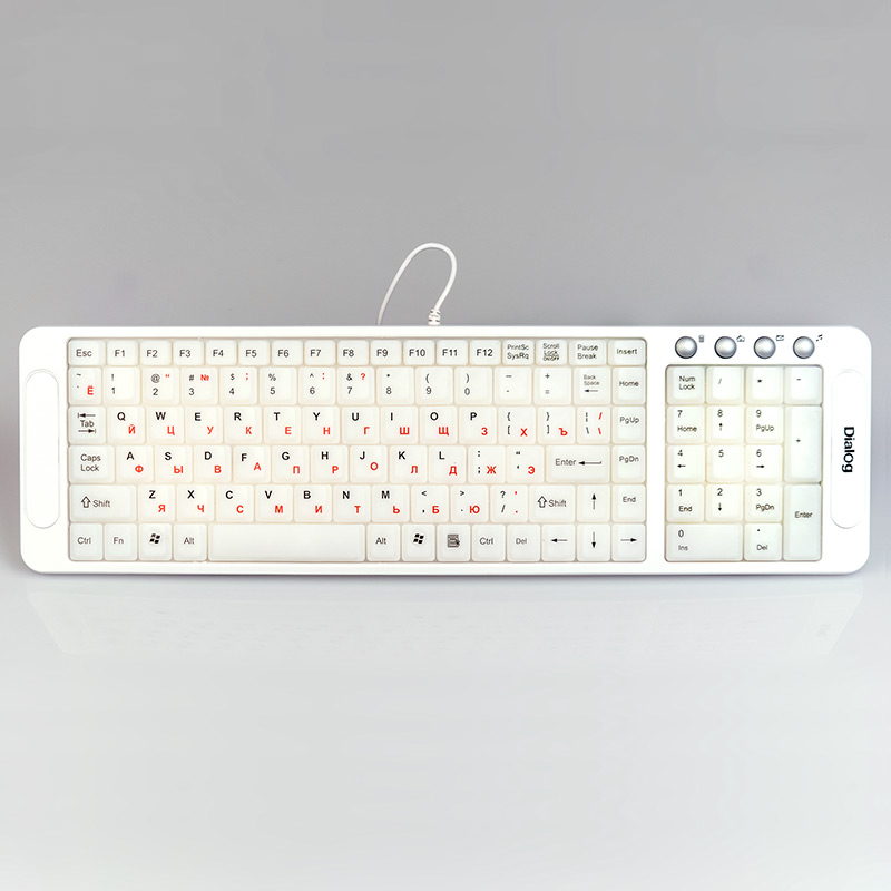 Клавиатура Dialog Katana KK-L04U, USB, белая Клавиатура: DIALOG KK-L04U White Интерфейс USB Корпус Белый матовый пластик. Белые клавиши, черная латиница, красная кириллица. Количество клавиш 109 Клавиши Windows да Мультимедиа-клавиши да, 4 клавиши над цифровым блоком Подсветка клавиш да. Клавиши подсвечиваются полностью, цвет - голубой Регулируемый угол наклона клавиатуру можно приподнять подклеивающимися резиновыми полусферами (в комплекте) Длина кабеля, м 1.5 Габаритные размеры (В*Ш*Г, мм) 415*120*15 Вес (кг) 0,430 Комплект поставки клавиатура, самоклеящиеся резиновые ножки, гарантийный талон, упаковка