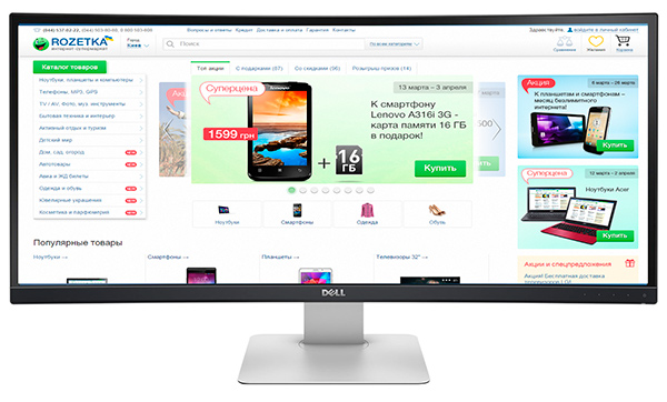 Монитор DELL CURVED U3415W Black Изогнутый монитор Dell U3415W формата WQHD с разрешением 3440х1440 с кинематографической четкостью, превосходным звуком и ультра-широкой областью обзора погружает в совершенно новый цифровой мир и обеспечивает невероятное удобство использования. Монитор поставляется с заводской калибровкой, благодаря чему обеспечивает 99% охват цветового пространства sRGB. Благодаря ультратонкой рамке вокруг дисплея, Dell U3415W можно использовать в мультиэкранных инсталляциях. Углы обзора экрана составляют 178 градусов по вертикали и 172 — по горизонтали. Время отклика матрицы в режиме Fast заявлено на уровне 5 мс, а максимальная яркость дисплея составляет 300 кд/м?, максимальная статическая контрастность — 1000:1. Из разъемов в мониторе имеются 6-портовой хаб USB 3.0, HDMI 2.0 (MHL), аудиовыход, DisplayPort (1.2), DisplayPort (MST) и Mini-DisplayPort. За качество воспроизводимого звука отвечают стереодинамики общей мощностью 18 Вт. С помощью функций Picture-by-picture и Picture-in-picture можно одновременно выводить на экран содержимое с двух компьютеров, а с помощью передающих портов USB 3.0 — использовать одну клавиатуру для перехода по содержимому обоих компьютеров. Диагональ дисплея 34" Максимальное разрешение дисплея 3440x1440 Тип матрицы IPS Интерфейсы HDMI miniDisplayPort 2 x DisplayPort Время реакции матрицы В ускоренном режиме - 5 мс В нормальном режиме - 8 мс. Встроенный тюнер Нет Яркость дисплея 300 кд/м? Контрастность дисплея 1000:1 (номинал) 2 млн :1 (максимум) (динамический коэффициент контрастности) Особенности Поддержка MHL USB-концентратор Регулировка по высоте Изогнутый экран Частота обновления 60 Гц