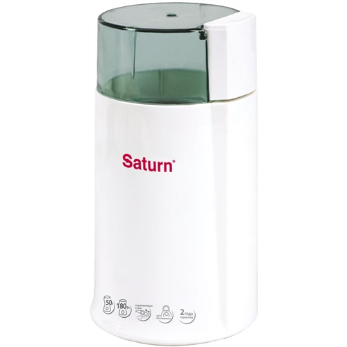 SATURN ST-CM1033W Электрическая кофемолка SATURN ST-CM1033W работает с мощностью 180 Вт. Ротационный нож эффективно измельчает продукт. Предусмотрен импульсный режим. Модель предназначена для измельчения кофейных зерен, орехов и специй. Блокировка от случайного включения.