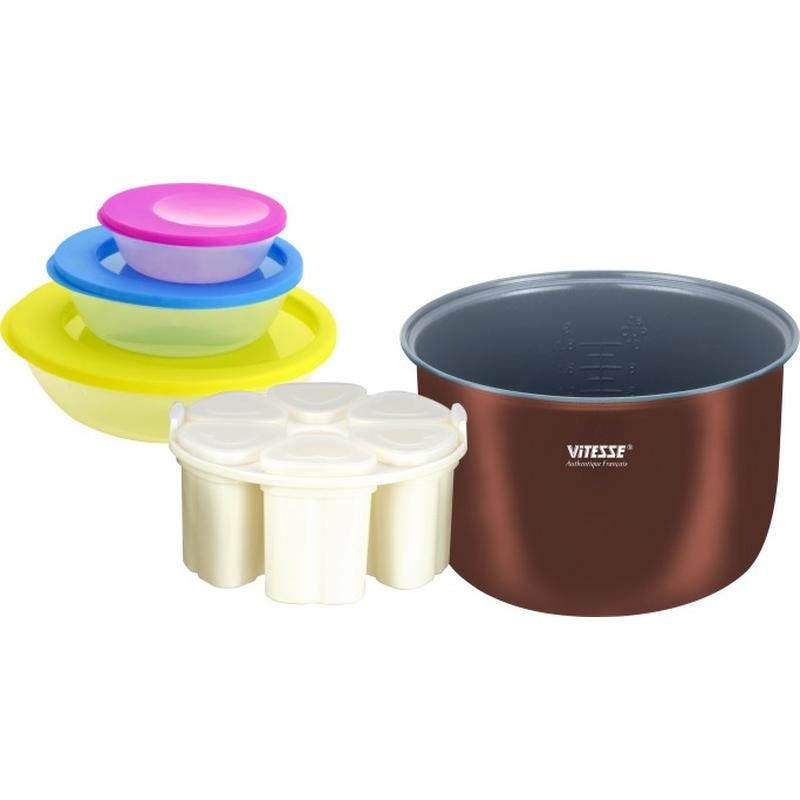 VITESSE набор для мультиварки VS-0579 Сменная чаша для мультиварки Толщина стенок, мм — 1,8. Внешнее термостойкое покрытие. Внутреннее керамическое покрытие Eco-Cera®. Цвет — Медный. Объем чаши — 5, л. Набор для приготовления йогурта Емкость стаканчика — 200 мл. 6 стаканчиков = 6 йогуртов с разным вкусом одновременно. Крышечки стаканчиков для хранения йогурта в холодильнике. Подставка для равномерного размещения стаканчиков в чаше (обеспечивает оптимальную микросреду для приготовления йогурта). Набор контейнеров для хранения (3 шт.) Емкость — 1125 мл, 538 мл, 196 мл. Можно использовать в микроволновой печи, морозильной камере. Можно мыть в посудомоечной машине. Чаша из набора VS-579 подходит для мультиварок: Vitesse VS-516, VS-518, VS-519, VS-529, VS-571, VS-573, VS-574, VS-581, VS-590GN, VS-590, VS-590GD, VS-591, VS-593, VS-597, VS-598PK, VS-3007, VS-3009 Чаша из данного набора не подходит для использования в скороварках. Тип чаша, баночки, контейнеры Количество предметов 5 Внутреннее покрытие керамика Совместимые производители Vitesse Совместимые модели VS-516, VS-518, VS-519, VS-529, VS-571, VS-573, VS-574, VS-581, VS-590GN, VS-590, VS-590GD, VS-591, VS-593, VS-597, VS-598PK, VS-3007, VS-3009 Производитель Vitesse
