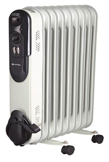 VITEK VT-2113 Тип масляный радиатор Регулировка мощности есть Уровни мощности 2000/1000/800 Вт Площадь обогрева 25 кв.м Напряжение 220/230 В Термостат есть Управление механическое, регулировка температуры, выключатель со световым индикатором Таймер нет Wi-Fi нет Bluetooth нет Варианты монтажа напольный Каминный эффект есть Удобство использования отделение для шнура, колесики, ручка