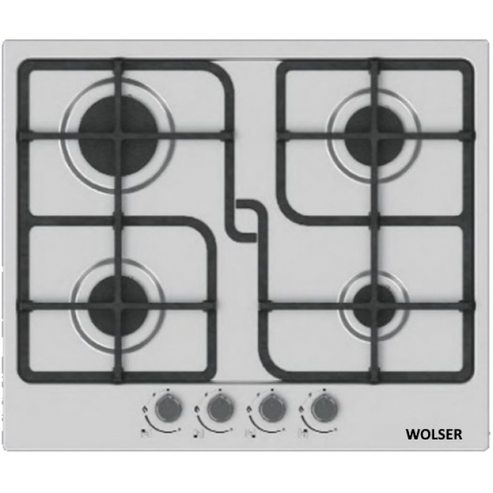 Варочная панель Wolser WL-F 6401 CE Материал поверхности: нержавеющая сталь Решетки: чугун Тип:Газовая Форсунки:Натуральный газ Комплект форсунок для пропан-бутана Газ-контроль горелок Электроподжиг