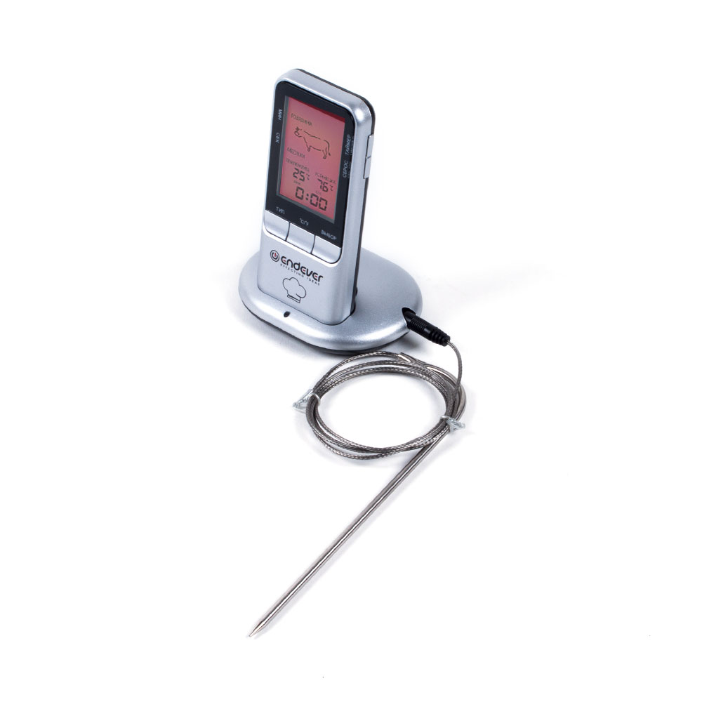 Термощуп ENDEVER Smart-05 Термощуп Endever Smart-05 поможет Вам определить как температуру блюда и/или продукта, так и определить вид мяса наряду со степенью его прожарки. Модель имеет 20 режимов, и может измерять температуру как по Цельсию, так и по Фаренгейту. В термощупе также имеется функция таймера, поэтому возможна эксплуатация устройства не только в качестве термометра. Компактные размеры и сравнительно небольшое энергопотребление, наряду с количеством функций, делают термощуп Endever Smart-05 одним из лучших помощников на кухне. Тип термощуп Модель Endever Smart-05 Цвет серебристый Основные характеристики Виды мяса баранина, говядина, индейка, котлета (фарш), курица, птица, рыба, телятина Количество степеней прожарки мяса 6 Минимальная температура измерения (°С) 0 °С Максимальная температура измерения (°С) 250 °С Индикация LED-дисплей Материал щупа сталь Материал корпуса пластик Предустановленные настройки 6 степеней прожарки мяса, 8 видов мяса Тип питания батарейки ААА Количество элементов питания 4 Дополнительно 20 автоматических режимов, беспроводная передача показаний температуры до 20 м, ЖК дисплей, звуковой сигнал, кабель 1 м, переключение C°/F°, таймер на 100 мин., точность измерения 0.1 °С Ширина корпуса 5.5 см Высота корпуса 12 см Глубина корпуса 2.5 см