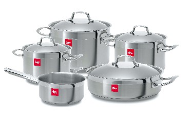 TEKA 49004840 Set vase pentru gatit - 9 piese. Material: otel inoxidabil. 5 piese constand in: oala cu capac O 240mm (1 buc.), oala cu capac O 200mm (1 buc.), oala cu capac O 160mm (1 buc.), platou cu manere si capac O 280mm (1 buc.), cratita O 160mm (1 b