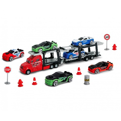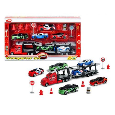 Dickie Set auto "Transporter" 6 auto Dickie Игровой набор "Transporter" Игровой набор Transporter Set от производителя Dickie позволит мальчику представить себя в роли управляющего транспортной компании. B комплекте ребенок найдет 2 больших трейлера для перевозки, а также 6 легковых машинок. Для того, чтобы обеспечить безопасное и максимально быстрое передвижение по дорожным путям, можно будет использовать специальные дорожные знаки, которые также входят в набор. Комплект: трейлер, 6 машинок, дорожные знаки. Длина трейлера: 26 см Рекомендуемый возраст: от 3-х лет