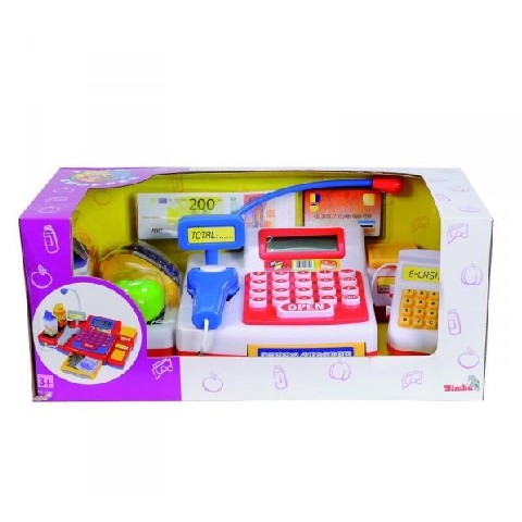 Simba Set de joc "Checkout & scaner" Simba Kассовый аппарат "Супермаркет" со сканером и аксесс Детский кассовый аппарат "Супермаркет" со сканером и аксессуарами замечательно подойдет для игры в магазин. Наша касса ни чуть не уступает настоящей, в ней есть все, что нужно для игры: сканер, терминал, лента для продвижения товаров, игрушечные деньги и корзина с игрушечным набором продуктов. Касса "Супермаркет" со сканером и аксессуарами с настоящим калькулятором. На экране в кассе четко видна сумма, которую необходимо оплатить. Сюжетно-ролевые игры полезны и важны для деток, ведь они учат находить общий язык со сверстниками, кроме того касса учит считать. Питание: батарейки 3 х 1.5V LR6 (не входят в комплект) Комплектация: сканер, терминал, лента для продвижения товаров, игрушечные деньги, корзина с игрушечным набором продуктов. Рекомендуемый возраст: от 3 лет