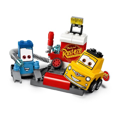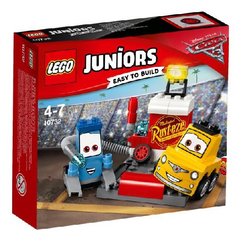 Guido and Luigi's Pit Stop LEGO Juniors "Пит-стоп Гвидо и Луиджи" Весело проводи время с добродушным Гвидо и его лучшим другом Луиджи, пока они ожидают заезда гоночных автомобилей на пит-стоп. В наборе есть всё, что нужно, чтобы воссоздать события мультфильма Тачки 3: шланг подачи воздуха, канистра и запасное колесо. Но не отвлекайся: если заметишь, что к тебе на полной скорости мчится крутой гоночный автомобиль, не забудь показать знак пит-стопа с цифрой "95"! Количество деталей: 75 Детям: от 4 лет до 7 лет