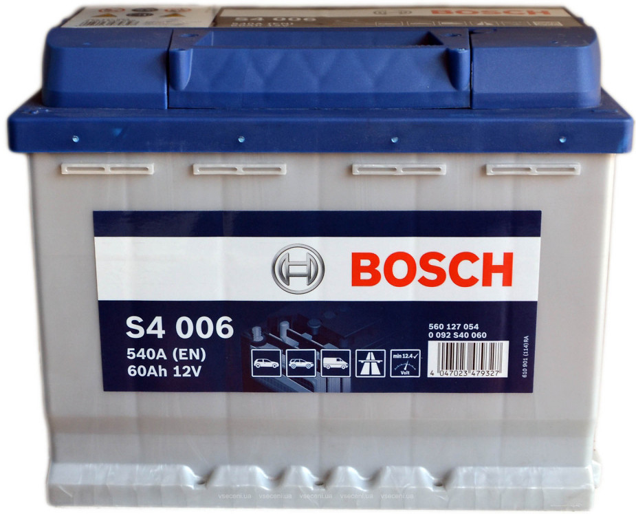 Bosch Аккумулятор 60AH 540A(EN) клемы 1 (242x175x190) S4 006 Напряжение (В): 12 Ёмкость батареи (Ач): 60 Ток холодного пуска (A): 540 Полярность: 1 Размеры (ДхШхВ) мм: 242x175x190