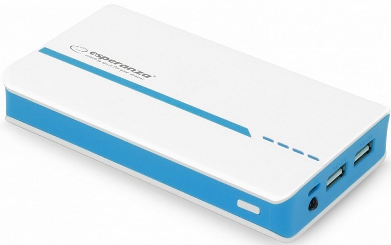 11000mAh Power Bank - Esperanza EMP107WB, White/Blue, Power capacity: 11000mAh, Portable Battery Charger with 2 x USB output sockets, Four LED Power capacity indicators, Output power: 5V/1A, 2A