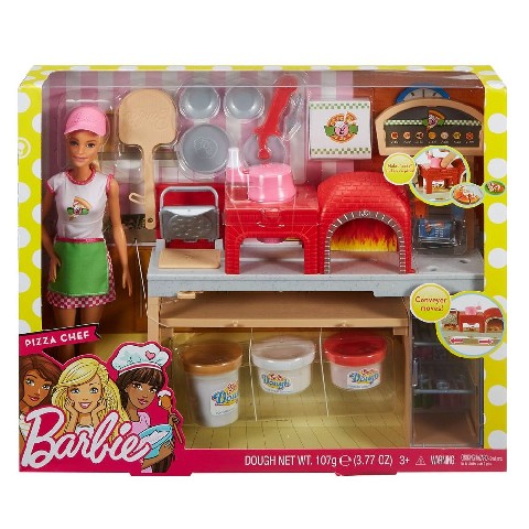 Barbie "Pizzamaker" Mattel Mattel Barbie "Шеф-повар в пиццерии" С этим набором юные гурманы вместе с Барби могут приготовить собственную кукольную пиццу из разноцветного теста для лепки, которое входит в комплект. Раскатывайте тесто, добавляйте соус и сыр, "выпекайте" в печи разрезайте на порции и подавайте! Bысота куклы: 30 см Набор содержит все аксессуары, которые вы видите на картинке и куклa Барби. Рекомендуемый возраст: oт 3-x лет
