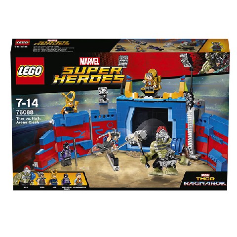 Thor vs. Hulk: Arena Clash LEGO Lego Super Heroes "Тор против Халка: Бой на арене" Битва Халка и Тора — один из решающих боёв фильма "Тор: Рагнарёк". Близкие друзья вынуждены сражаться друг с другом из-за воздействия злодея Гроссмейстера. За этой же битвой наблюдает злодей из предыдущих частей саги, брат Тора — знаменитый Локи. Он заодно с Гроссмейстером. Их также поддерживает сакааранец, чёрно-фиолетовый воин. Арена окружена красно-синими стенами. Они соединяются между собой подвижными связками. Вся площадка освещается подвижными прожекторами. А на самом верху находится трон Гроссмейстера, с которого он наблюдает за боем. Помоги Тору победить Халка в доспехах с огромным топором, но так, чтобы они остались друзьями! Количество деталей: 492 В набор входит: Фрагмент арены, 5 минифигурок – Тор, Халк, Локи, Гроссмейстер, сакааранец. Игровые аксессуары: оружие, дополнительная прическа. Рекомендуемый возраст: 7 - 14 лет