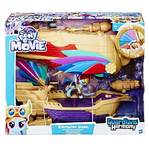 MLP SOARING SWASHBUCKLER PIRATE AIRSHIP HASBRO Hasbro MLP Игровой набор "Стражи Гармонии - Радуга Дэш" Игровой набор из серии "Май литл пони" предлагает ребенку сыграть за Радугу Дэш, выступающей в роли одного из стражей Гармонии. В своем распоряжении пони имеет "летающий корабль", оснащенный крыльями и 2 реактивными двигателями и передвигающийся на колесиках. На борту корабля размещаются ящик с сокровищами, бочки с порохом, а также ручное оружие для Rainbow Dash. Для последней, кстати, предусмотрено индивидуальное транспортное средство в виде крылатого скутера. В верхней части корабля имеется специальный открывающийся отсек для хранения вышеперечисленных дополнительных предметов. Фигурка пони имеет 9 точек подвижности, что сделает ее артикуляции разнообразнее. Основной единицей вооружения служит пушка, из которой можно выстреливать разными видами снарядов, представленных в комплекте. Высота фигурки: 9 см Комплект: фигурка Рейнбоу Дэш, транспортное средство, пушки, снаряды, аксессуары. Рекомендуемый возраст: 4 года +