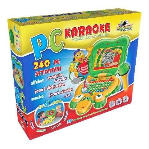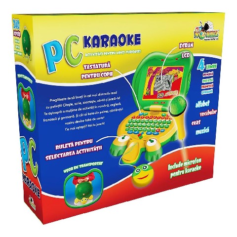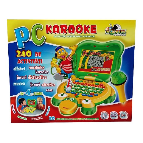 COMPUTERUL TESTOASA - PC KARAOKE 2017 NORIEL Noriel Hоутбук Kараоке "Электронная черепаха" Мудрая черепаха спрятала в своем панцире три маленьких сокровища радости: игра, музыка и учеба! Игрушечная черепаха это электронная игрушка типа "ноутбук" с откидной крышкой, мышкой (черепаховая голова) и караоке с микрофоном. Функции и клавиши аналогичны функциям настоящего ноутбука. Караоке включает 60 образовательных мероприятий на 4 языках (румынский, английский, французский и немецкий). Рекомендуемый возраст: от 3 лет