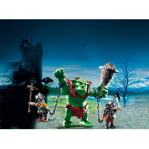 Giant Troll with Dwarf Fighters PLAYMOBIL Plaimobil "Рыцари Гигантский тролль и боевые гномы" В пещере живет огромный зеленый тролль, он пугает людей и никого не пропускает... Его руки с подвижными суставами крутятся в разные стороны. В одной руке зажата большая дубинка, которой тролль размахивает в разные стороны. Чтобы пройти мимо, нужно позвать боевых гномов. Они умеют управляться со злобным великаном. На руки ему наденут браслеты с цепями и не дадут размахивать руками. Ребенок сможет поместить тролля в подземелье замка рыцаря Ястреба и поручить ему охрану потайного хода. Рекомендуемый возраст: от 4 до 10 лет