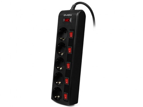 Surge Protector SVEN SF-05PL, 5 Sockets, 3.0m, Black Компания SVEN представляет сетевой фильтр SF-05PL. Это настоящий профи в деле защиты оборудования от проблем с электропитанием. Устройство от SVEN – отличный выбор для тех, кто ценит надежность и безопасность. Модель SVEN SF-05PL в черном корпусе из негорючего пластика оснащена пятью розетками с индивидуальными выключателями и световой индикацией рабочего состояния. Также у этой модели есть общий выключатель с функцией термозащиты, обесточивающий все розетки устройства одним нажатием. Сетевой фильтр SVEN оборудован варистором – он надежно защищает подключенные устройства от высоковольтных помех. SVEN SF-05PL – удобное и надежное решение для дома и офиса. Модель выпускается в двух вариантах – с длиной шнура 1,8 и 3 метра. Ее можно размещать не только на полу – конструкция фильтра предусматривает возможность настенного крепления