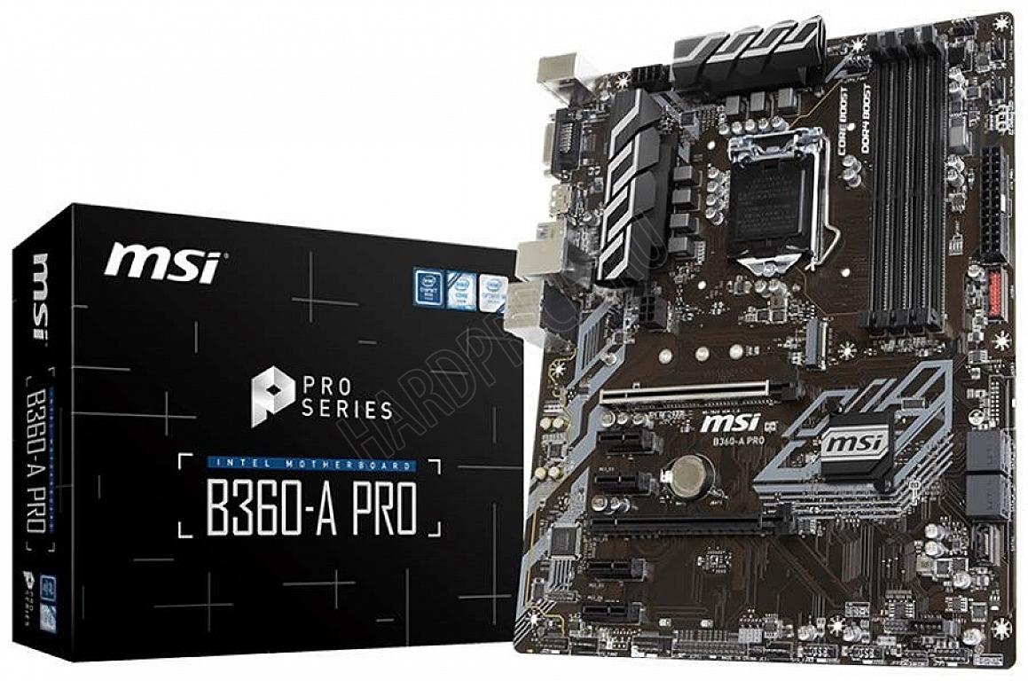 Материнская плата MSI B360-A PRO, Socket 1151, ATX материнская плата форм-фактора ATX сокет LGA1151 v2 чипсет Intel B360 4 слота DDR4 DIMM, 2133-2666 МГц поддержка CrossFire X разъемы SATA: 6 Гбит/с - 5