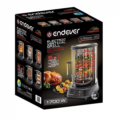 Электрический вертикальный гриль Endever Grillmaster 300 Мощность (Вт): 1700 Номинальное напряжение (В): 220 В, 50 Гц Материал корпуса: стекло, металл Габаритные размеры: 28.2*33.3*45 Особенности и дополнительные функции: 5 функций в 1: курица-гриль, шаурма, кебаб, запеченая рыба, овощи-гриль Термостойкое защитное стекло корпуса позволяет контролировать процесс приготовления. Внутренная подсветка режима нагрева Автоматическая фиксация дверцы при закрывании Вращающаяся на 360° стеклянная дверца с удобной ненагревающейся ручкой Таймер на 60 минут с автоматическим звуковым отключением Прорезиненные ножки Комплект поставки:Вертикальный гриль Семь шампуров для шашлыков и кебаба с фиксаторами Вертел с вилками и поддоном для сбора жира Две решётки для рыбы Три поддона для запекания продуктов (Один поддон для сбора лишнего жира или капель) Корпус с нагревателем Руководство по эксплуатации Гарантийный талон
