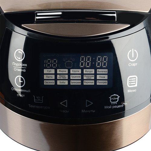 Мультиварка Polaris PMC 0557AD 5л black/copper Режимы работы: Мой рецепт Plus, Суп, Жарка, Крупа, Йогурт, Выпечка, Паста, Варка на пару, Тушение, Молочная каша, Плов, Овсянка, Бобы, Запекание, Варенье, Разогрев. Сенсорная панель управления. Поддержание температуры 24 часа. Таймер отсрочки до 24 часов позволяет приготовить еду к назначенному времени. Сохранение программы при сбое электропитания – 20 минут. Объем чаши 5 л позволяет приготовить блюдо до 10 порций. Антипригарное покрытие внутренней чаши – прочное, устойчивое к царапинам, безопасное для здоровья. Чаша оснащена удобными ручками. Чашу можно мыть в посудомоечной машине. Съемный шнур. Аксессуары: - плоская ложка; - мерная чашка; - контейнер пароварка. Книга рецептов в подарок. Объем чаши, л 5 л Покрытие чаши Антипригарное Количество программ 15 Мощность, Вт 860 Вт