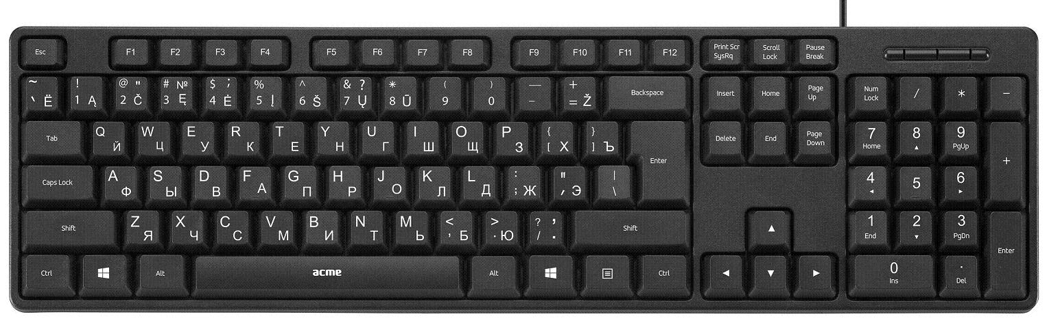 Клавиатура Acme KS06 USB Black Клавиатура KS06 выполнена в классическом дизайне, а так же обладает всем необходимым набором функций. Крупные клавиши обеспечивают отличную обратную отдачу и великолепные тактильные ощущения во время работы. Клавиатура имеет тонкий профиль для экономии рабочего пространства и комфортабельности. Количество кнопок 104 Дополнительные функции Размеры: 440 x 125 x 26 мм Длина кабеля: 1.5 м Интерфейс USB Тип упаковки Retail Длина кабеля 1.5 м Тип клавиатуры Мембранные Назначение Обычные Совместимость с ОС Microsoft Windows Тип Клавиатуры Размеры 440 x 26 x 125 мм