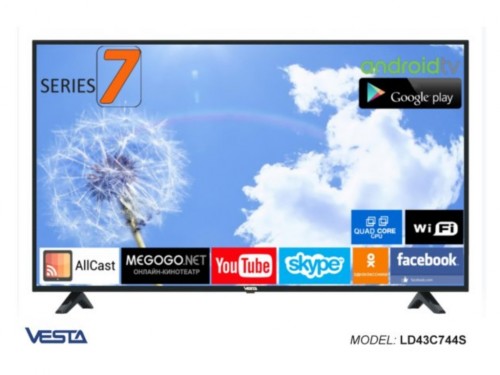 Телевизор Vesta LD43C744S Диагональ экрана 43 Разрешение экрана 1920х1080 (Full HD) Поддержка Smart TV Есть Операционная систем Android OS Частота, Гц 200 Тип матрицы TN USB 2 Динамики, Вт 10 Особенности WI-FI, EthernetТелевизор Vesta LD43C744S