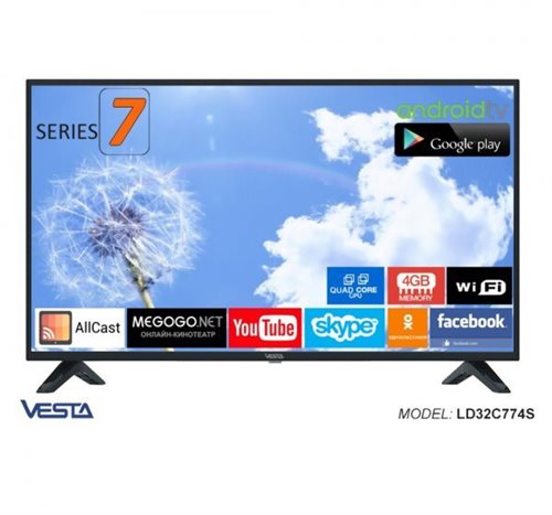 Телевизор Vesta LD32C774S Диагональ экрана 32 " Разрешение 1366x768 Изогнутый экран нет Динамическая контрастность 10 000 000:1 Угол обзора 176 ° Время отклика 2 мс Smart TV есть Wi-Fi есть Мощность звука 2x12 Вт Входы AV, компонентный, HDMI x3, VGA, USB x2, Ethernet (RJ-45), Wi-Fi Потребляемая мощность 55 Вт Цвет черный Размеры настенного крепления VESA 100x100 мм Размеры без подставки 725x430x90 мм Размеры с подставкой 725x480x90 мм Производитель Vesta