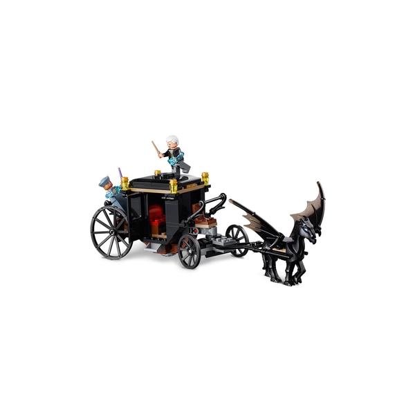 Grindelwald ?s Escape Сборная сочлененная каретка с открывающейся дверцей и съемной крышей Thestral фигура с навесными крыльями Взмахните крыльями Thestral, чтобы сбежать 2 минифигурки: Геллерт Гриндельвальд и Серафина Пикери Количество штук продукта: 132 штуки Собранные размеры: 25Lx7Wx8Hcm Содержание: Карета, Thestral, 2 палочки с аксессуарами для стрельбы и 2 минифигурки