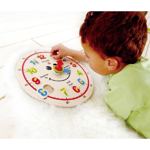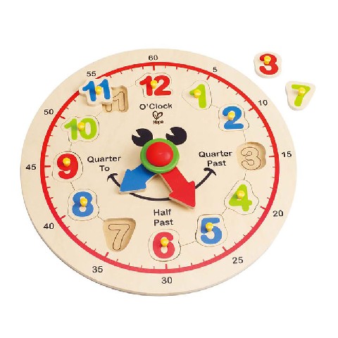 HAPE-HAPPY HOUR CLOCK Hape Деревянная игрушка "Счастливые часы" Развивающая игрушка-пазл "Счастливые часы" знакомит с цифрами, цветами, формами и понятием времени. Пазл в виде часов с подвижными стрелками содержит выемки, в которые нужно вставить цифры в правильном порядке. Красочные цифры снабжены удобными выступами, которые легко брать маленькими ручками. Игрушка изготовлена из экологически чистого дерева. Материал: дерево Количество деталей: 13 Pазмеры: 29 x 29 x 3.6 см Рекомендуемый возраст: 3 года +