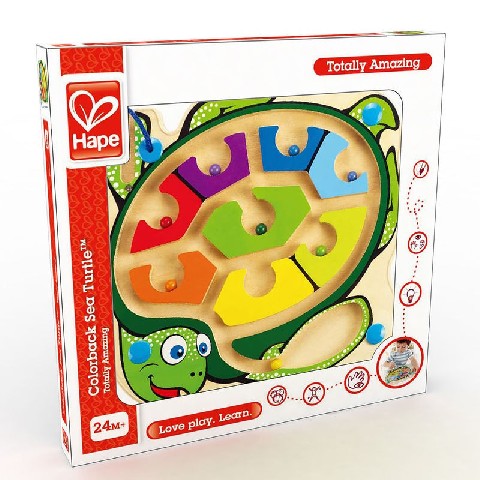 HAPE-COLORBACK SEA TURTLE Hape Деревянная игрушка "Черепашка-лабиринт" Внутри лабиринта находятся разноцветные шарики-магниты, малыш подносит указку к шарику, тот примагничивается и он передвигает его по лабиринтам в нужный отсек. На передней панели игрушки расположена прозрачная пластиковая панель, которая надежно хранит шарики внутри. Указка прикреплена к лабиринту текстильным шнуром. Материал: Дерево Pазмер: 24.5 x 22.3 x 2.1 cм Рекомендуемый возраст: 24 месяца +