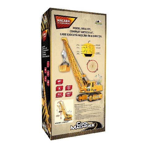 Cool Machines-macara cu telecomanda Noriel "Гусеничный кран с дистанционным управлением" Реалистичная модель крана с управляемым многофункциональным проводным пультом дистанционного управления. Он выполняет следующие функции: - Перемещается вперед / назад и влево / вправо - Имеет освещение и вращается на шасси - Кран управляется с пульта, поднимается / падает и растягивается. - Полностью сочлененный рычаг, который вращается на 680*. Размеры: длина - 21 см, высота - 47 см. Рекомендуемый возраст: 6 лет +