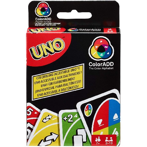 Joc UNO "Color ADD" Mattel Карточная игра UNO "Добавь цвета" Встречайте первую в мире карточную игру для тех, кто страдает цветовой слепотой - UNO "Добавь цвета"! В ее основе - система распознавания цвета ColorADD, которая использует символы, представляющие разные цвета. Эта уникальная система идентификации цвета позволяет игрокам с любой формой цветовой слепоты легко играть в UNO с друзьями и семьей. Правила игры те же, что и в классической версии UNO. Играть в игру могут как люди с нарушениями зрения, так и совершенно здоровые. В наборе 110 карт и инструкция. Рекомендуемый возраст: 7 лет +